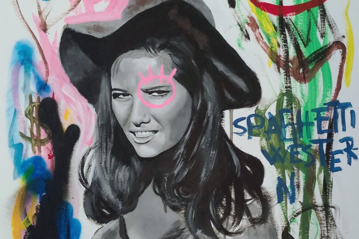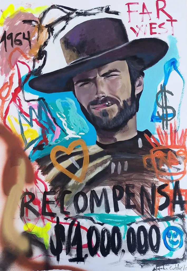 Corazones, caritas sonrientes o coronas aparecen integrados en figuras procedentes tanto de la iconografía popular como de la historia del arte o el imaginario western. Este último funciona como una referencia directa a su lugar de origen: el Desierto de Tabernas, un territorio que atraviesa simbólicamente su obra y refuerza la noción de identidad y pertenencia.